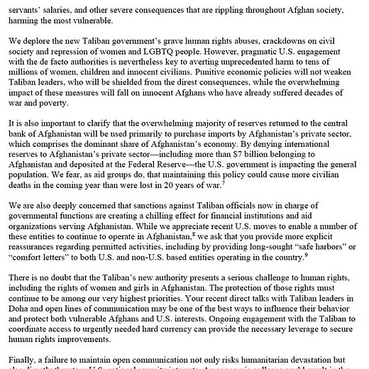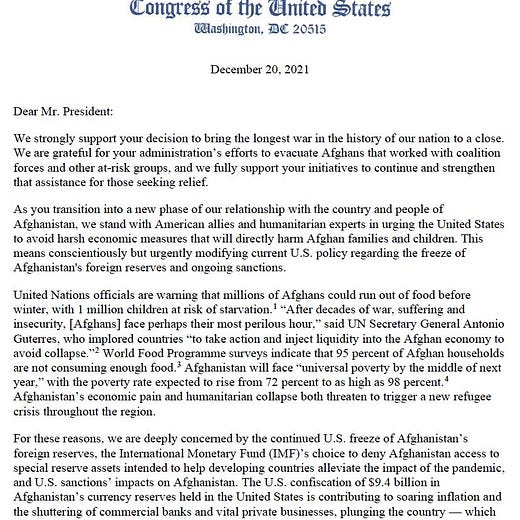 In a welcome sign that this issue is finally getting some attention, 40 House democrats yesterday signed a letter to President Biden and the Treasury department urging them to unfreeze Afghanistan’s funds.